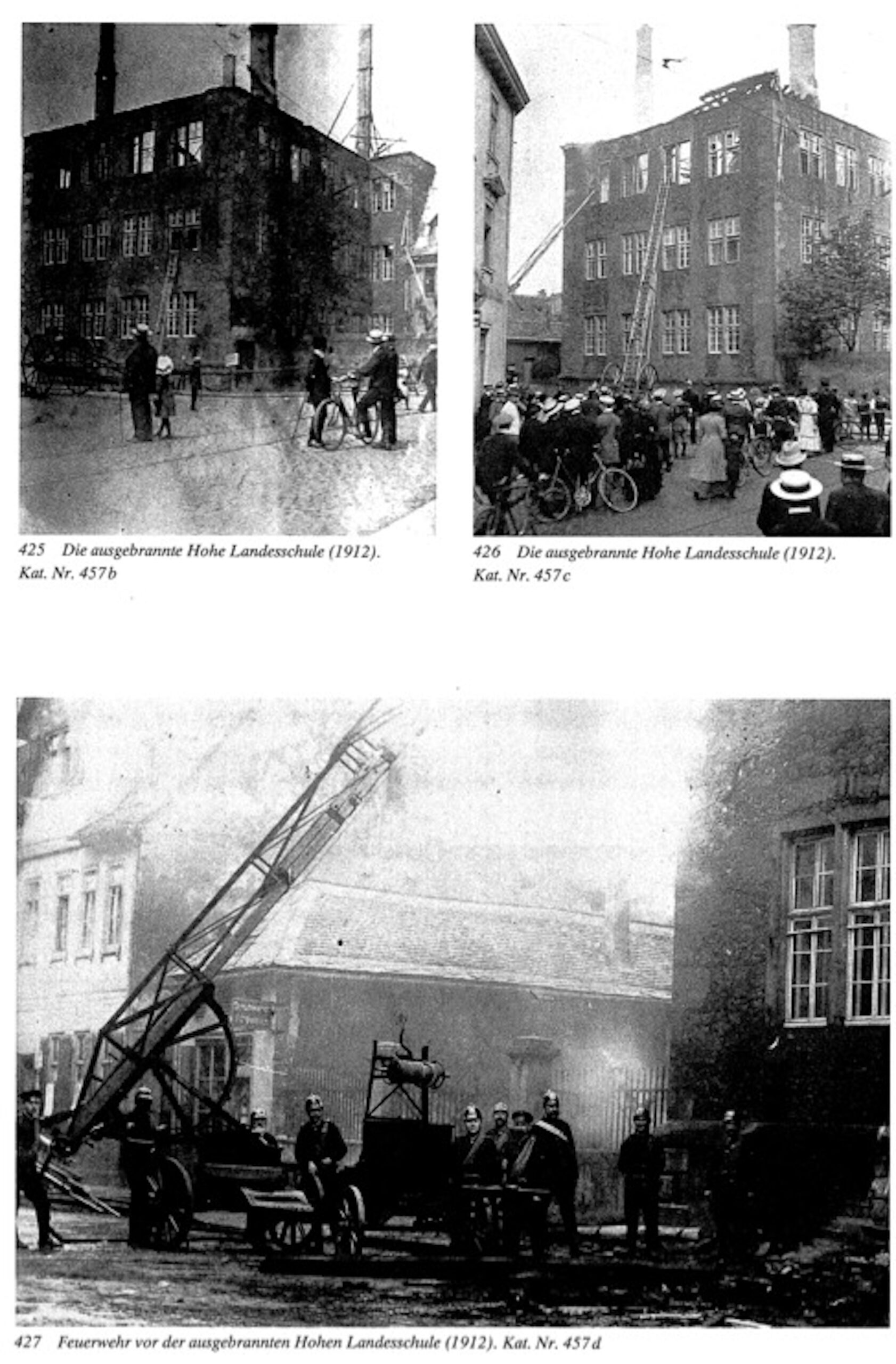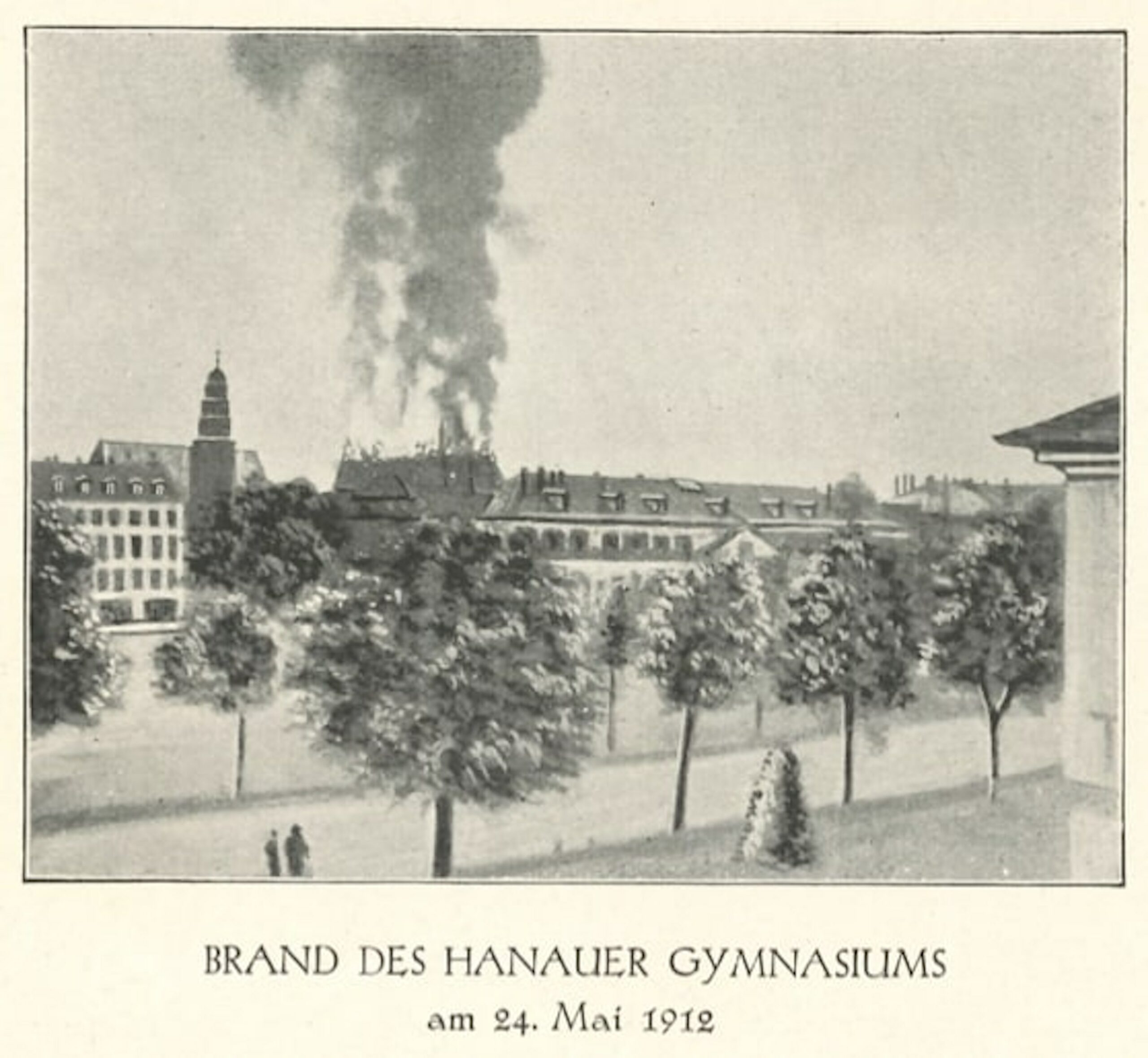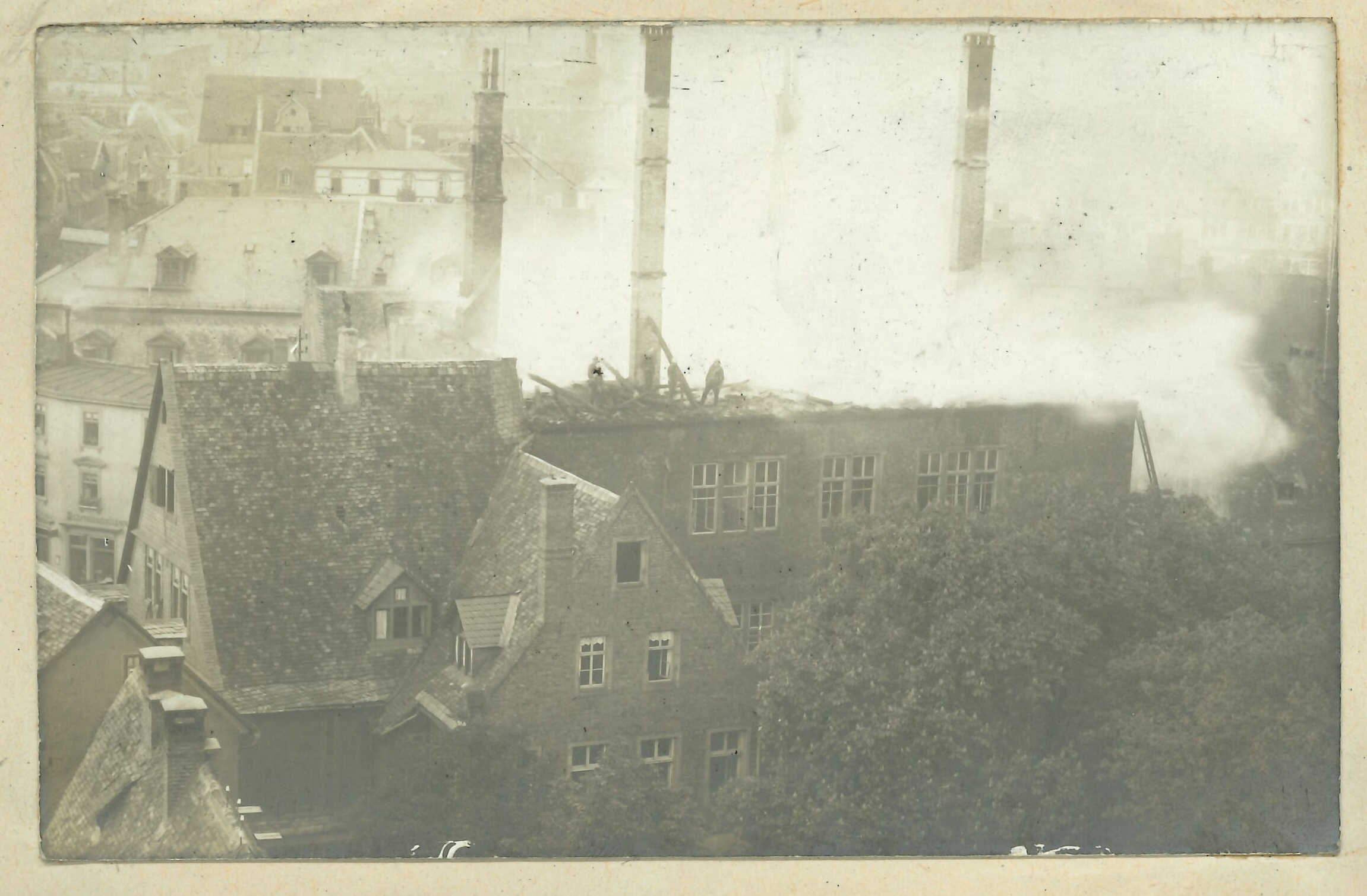 Am 24.05.1912 brannte der Dachstuhl der Schule (offiziell in Folge eines Blitzeinschlages, nach Aussagen von Heinrich Bott nach einer Zeichenstunde, bei der die Motivsuche die Schüler auf den Dachboden geführt hatte) und der Unterricht fand nach verlängerten Ferien vorerst im Landgerichtsgebäude statt.