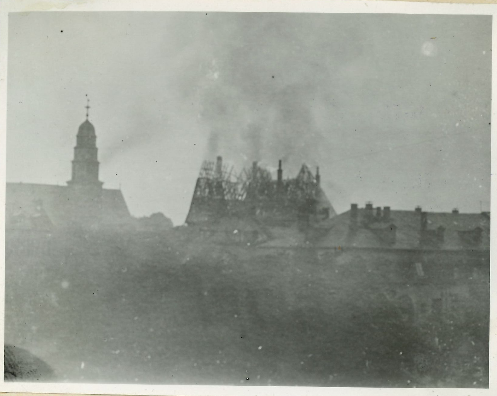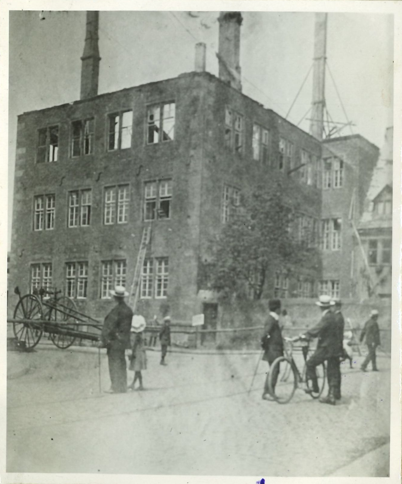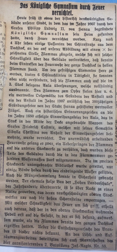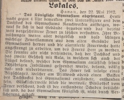 Am 24.05.1912 brannte der Dachstuhl der Schule (offiziell in Folge eines Blitzeinschlages, nach Aussagen von Heinrich Bott nach einer Zeichenstunde, bei der die Motivsuche die Schüler auf den Dachboden geführt hatte) und der Unterricht fand nach verlängerten Ferien vorerst im Landgerichtsgebäude statt.