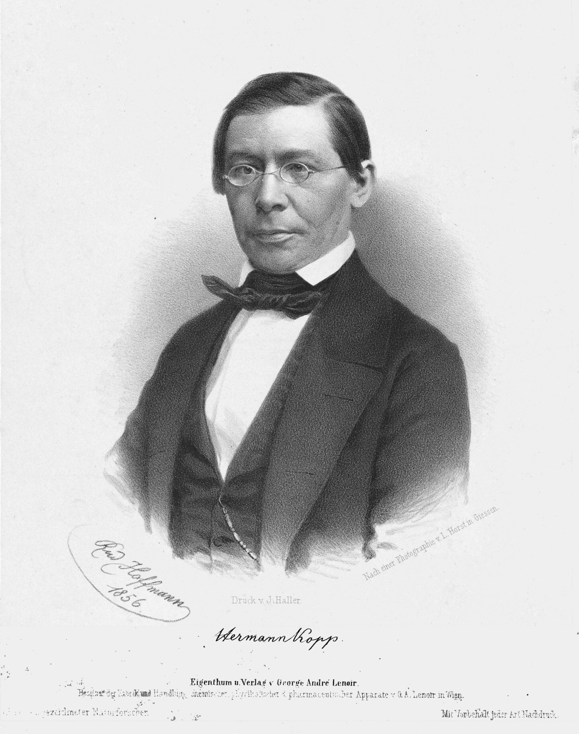 Darüber hinaus beschäftigte er sich mit Zusammenhängen zwischen Molekülmassen, relativen Dichten und spezifischen Wärmekapazitäten sowie der Relation zwischen kristalliner Form und chemischer Beschaffenheit zum spezifischen Volumen chemischer Verbindungen. Kopp publizierte auch auf diesem Gebiet, so z. B. mit Heinrich Buff das Lehrbuch der physikalischen und theoretischen Chemie im Jahr 1857.