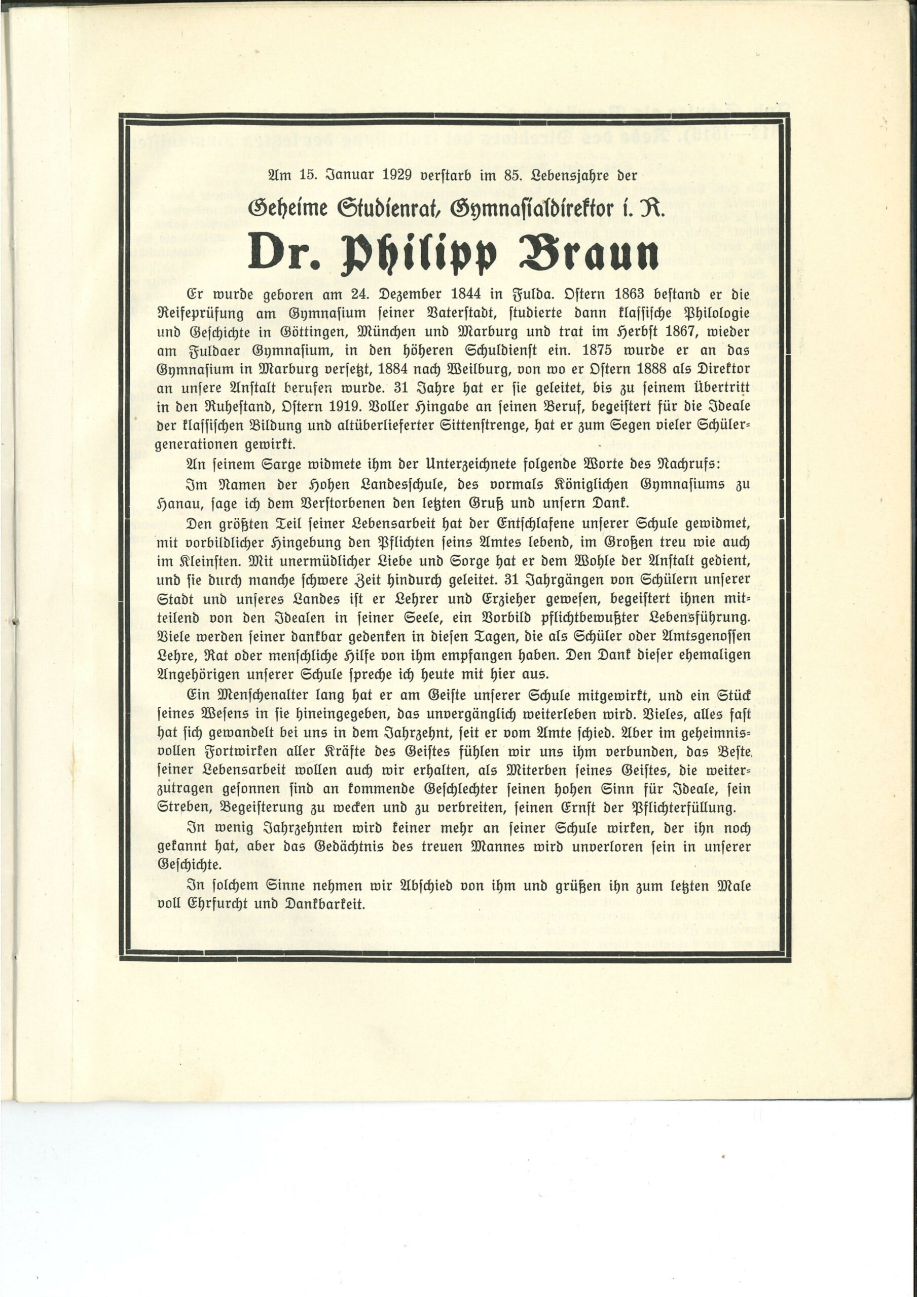 Braun, Philipp, geboren am 24. Dezember 1844 in Fulda, Sohn des verstorbenen Obersekretärs Braun, besuchte das Gymnasium seiner Vaterstadt und wurde Ostern 1863 mit dem Zeugnis der Reife entlassen. Nachdem er die Universitäten Göttingen, München und Marburg besucht und am 5. August 1867 das Examen in der klassischen Philologie und Geschichte vor der wissenschaftlichen Prüfungskommission zu Marburg bestanden hatte, wurde er zur Ablei- stung des Probejahres dem Gymnasium zu Fulda überwiesen. Gleichzeitig war er mit der Vesehung einer Leh- rerstelle betraut, bis er durch Verfügung vom 5. April 1869 zum sechsten ordentlichen Lehrer am Gymnasium zu Fulda ernannt wurde. Am 12. Mai 1869 wurde ihm von der philosophischen Fakultät zu Marburg die philosophi- sche Doktorwürde auf Grund seiner Dissertation: „Observationes criticae et exegeticae in C. Valerii Flacci Argo- nautica“ zuerkannt. Herbst 1875 wurde er an das Gymnasium zu Marburg an der Lahn versetzt, Herbst 1878 zum Oberlehrer an jener Anstalt befördert und Ostern 1884 in gleicher Eigenschaft an das Gymnasium in Weilburg versetzt. Ostern 1880 hat er zu einer Reise nach Italien und Griechenland auf ein Jahr Urlaub erhalten. In Weil- burg ist er bis zum 18. April 1888. Am 20. April 1888 tritt er sein Amt als Direktor des Gymnasiums zu Hanau an. An Programm-Abhandlungen hat er veröffentlicht: