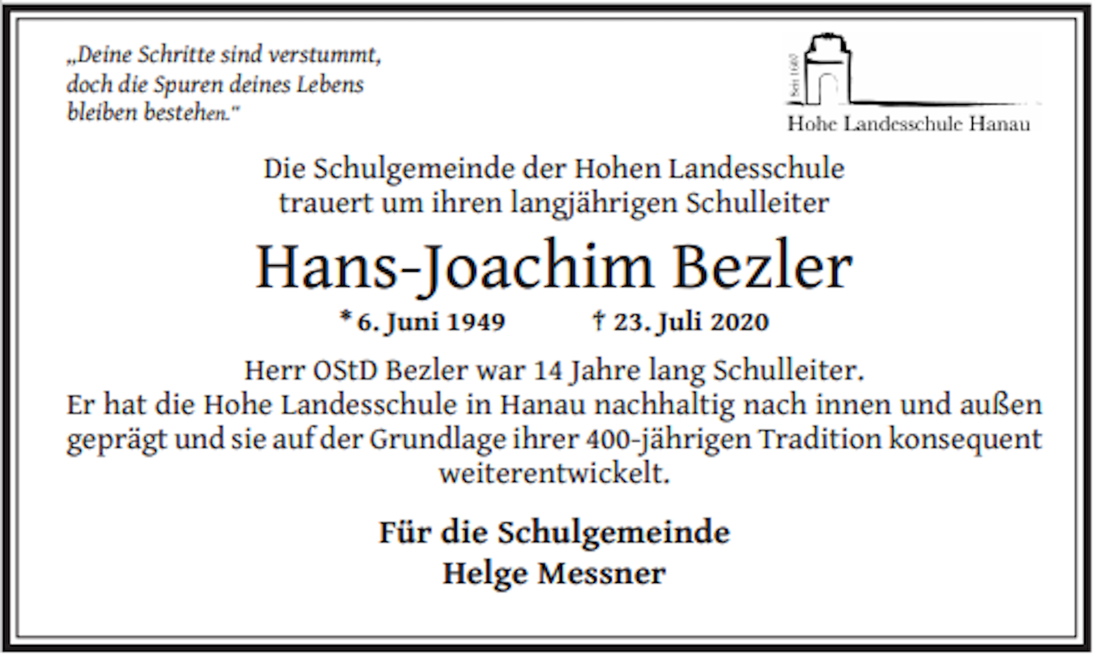 Jans Joachim BezlerBezler (* 6. Juni 1949, + 23. Juli 2020) war von 2000 bis 2014 Schulleiter der Hohen Landesschule.