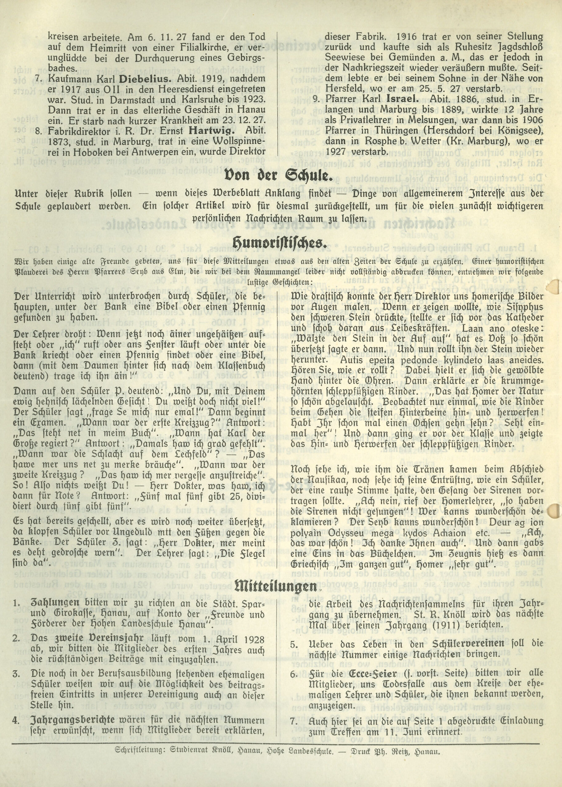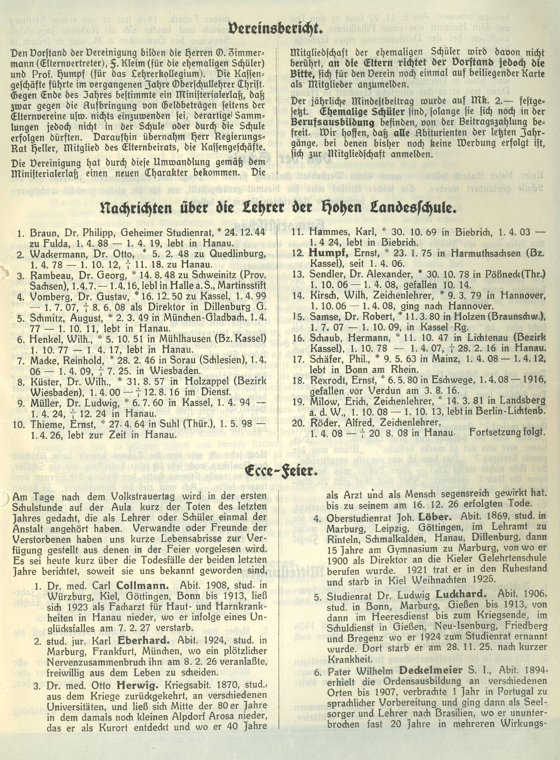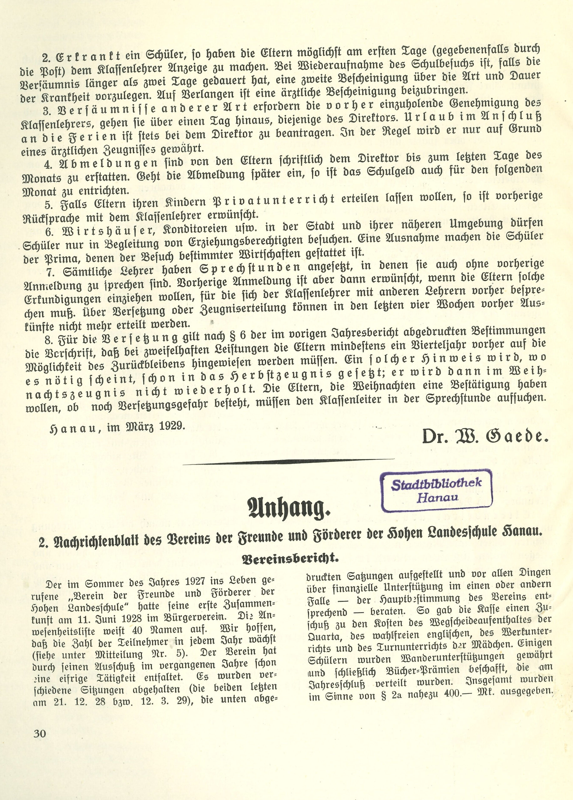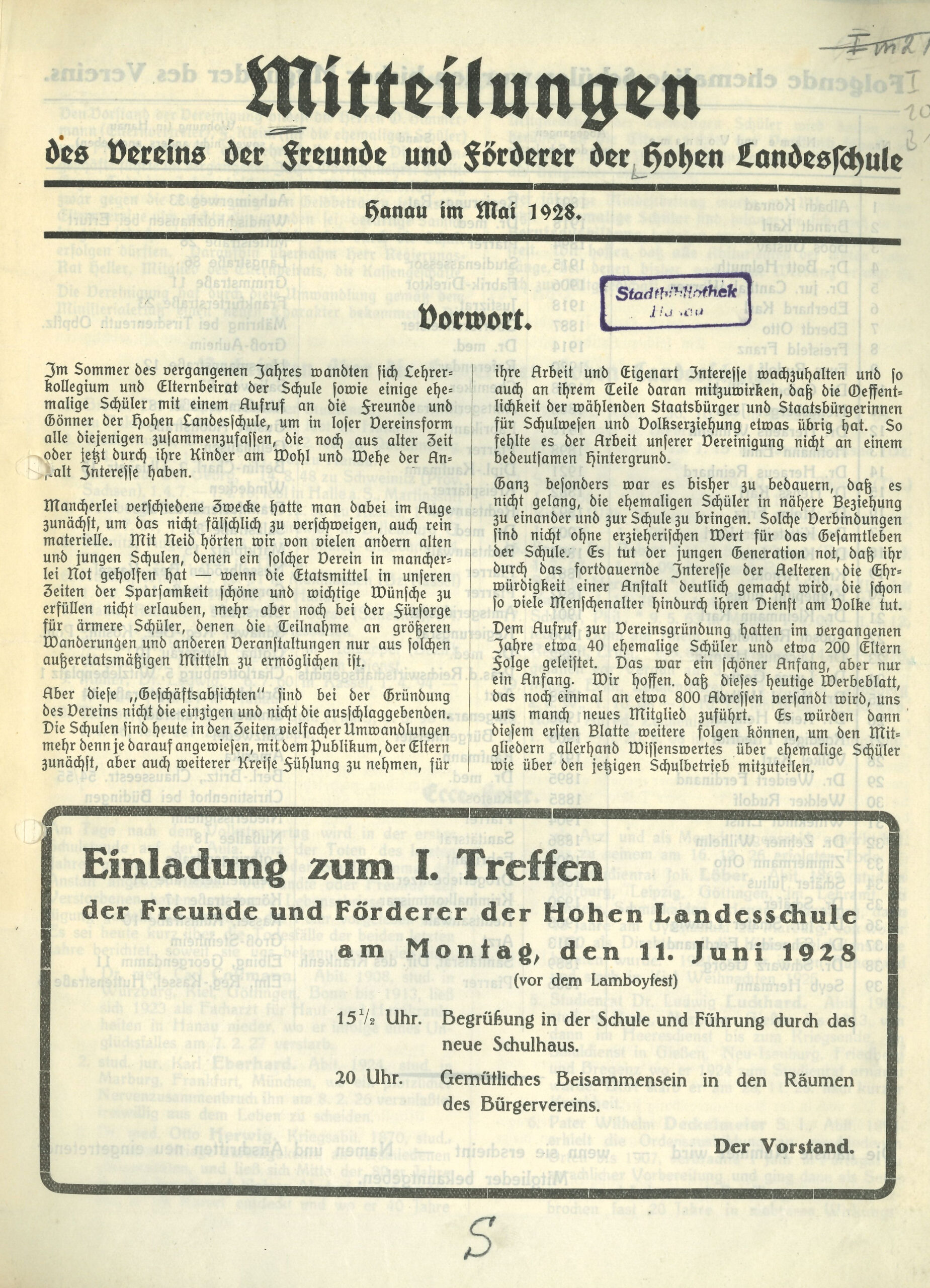 1928 wurden die Freunde und Förderer der Hohen Landesschule in der Zeit Direktor Wilhelm Gaedes (siehe hierzu unter „Schulleiter“) gegründet. In den Wirren des Zweiten Weltkrieges lag diese Institution brach. Erst 1954 wurde der Verein neu gegründet.