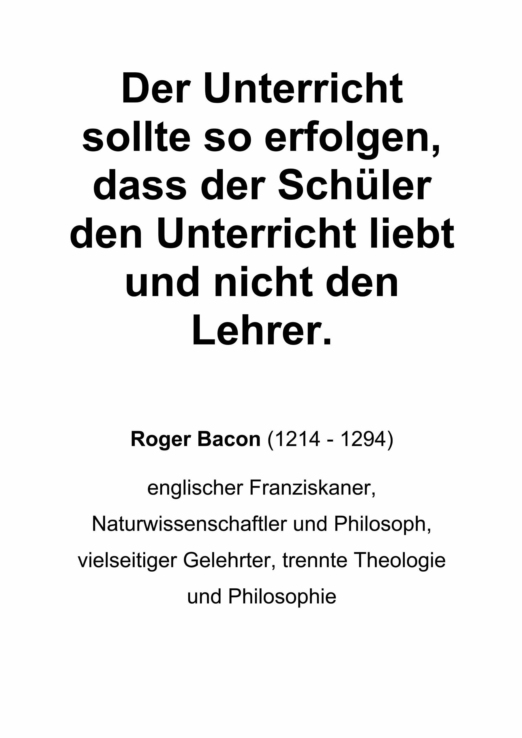 Das Zitat von Roger Bacon, einem englischen Franziskaner, Naturwissenschaftler und Philosoph, der im 13. Jahrhundert lebte, ist der Meinung, dass es bei dem Unterricht in der Schule nicht darum geht den Lehrer zu mögen, sondern den Unterricht.