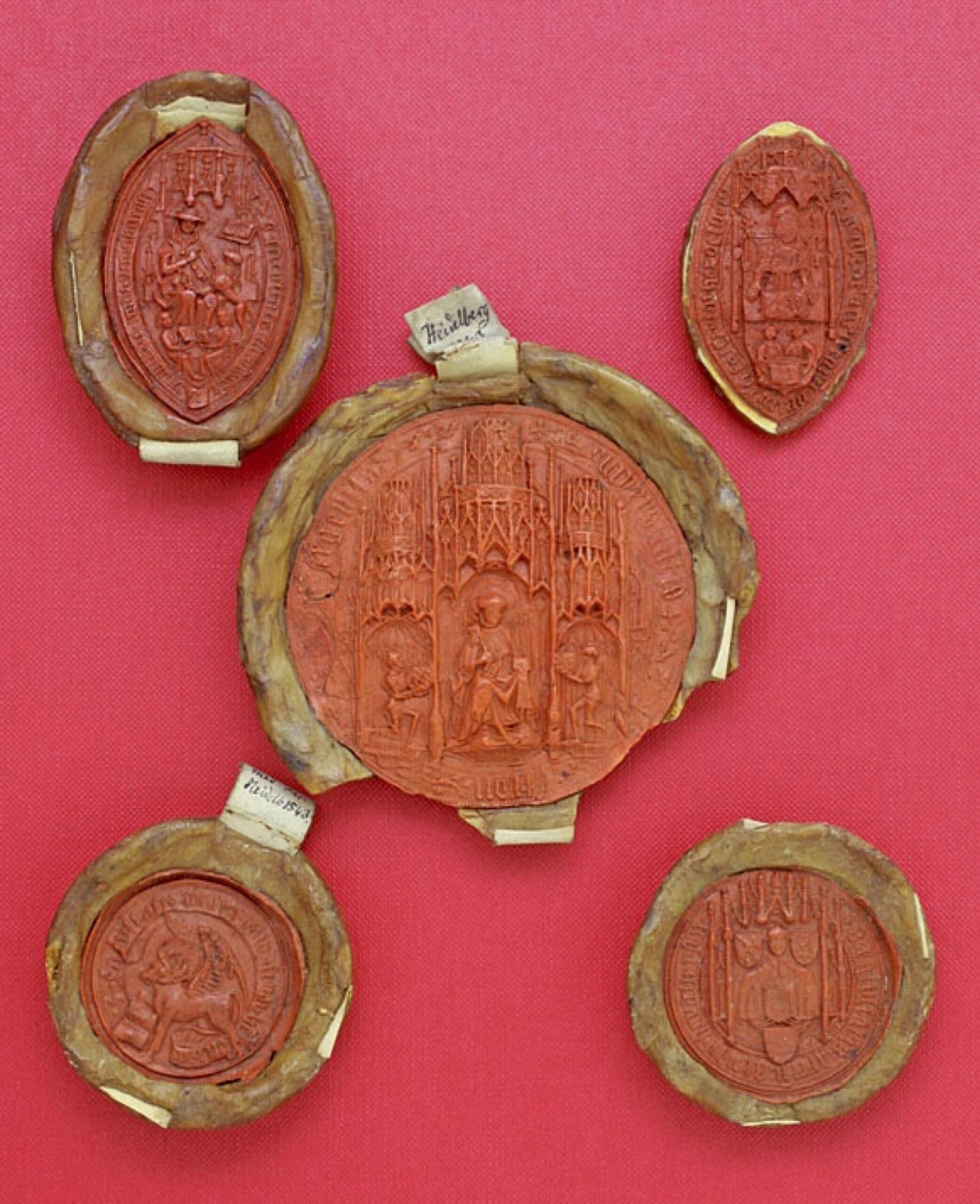 Im Foto (Bild 2) abgebildet sind fünf Siegel, die zur Universität Heidelberg gehörten und von ihr in Auftrag gegeben wurden. Das große Siegel in der Mitte zeigt den Schutzpatron Petrus in der Mitte sitzen Die beiden knienden Ritter könnten Kurfürst Ruprecht I. (rechts) und sein Neffe, Mitregent und Nachfolger Ruprecht II. (links) sein. Sie geben ihm jeweils ein Wappenschild. Oben links sieht man das Siegel der theologischen Fakultät der Universität. Es zeigt einen Lehrer gemeinsam mit zwei Schülern. Oben rechts ist das Siegel der Juristischen Fakultät zu sehen, es zeigt eine Unterrichtsszene, mit einem Doktor als Lehrer. Unten links ist das Siegel der medizinischen Fakultät, das einen geflügelten Stier zeigt. Der Stier soll den Evangelisten Lukas darstellen, der als Patron der Ärzte gilt. Unten rechts zu sehen ist das Siegel der Artistenfakultät. Es zeigt einen Gelehrten und um ihn herum ist das dreiteilige kurpfälzische Wappen abgebildet.[1]