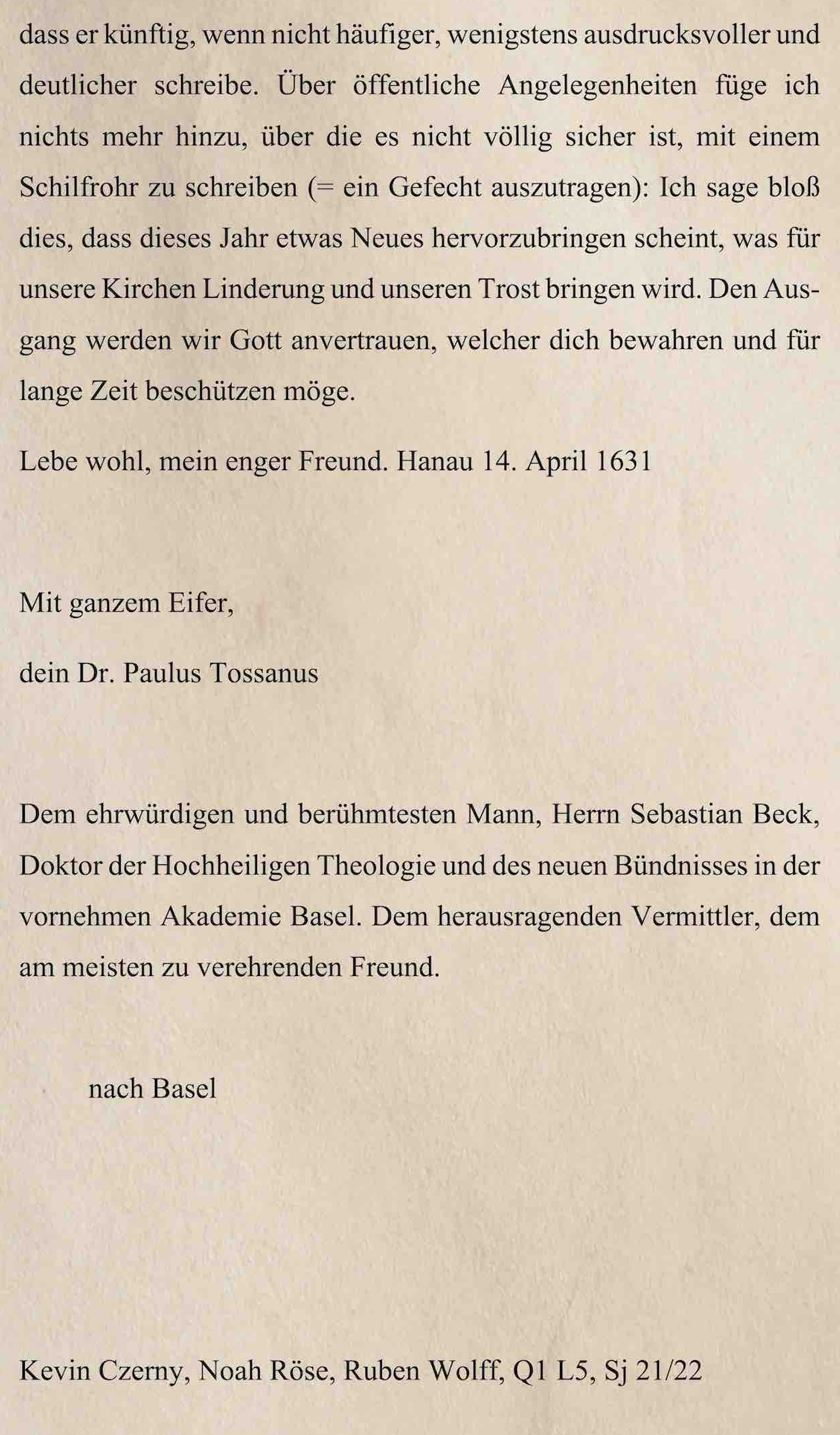 Dies ist meine Analyse eines historischen Briefes, den Dr. Paul Tossanus, ein Lehrer der Hohen Landesschule Hanau, am 14. April 1631 an seinen Freund Dr. Sebastian Beck, einen Doktor der Theologie an der Akademie in Basel, geschrieben hat.