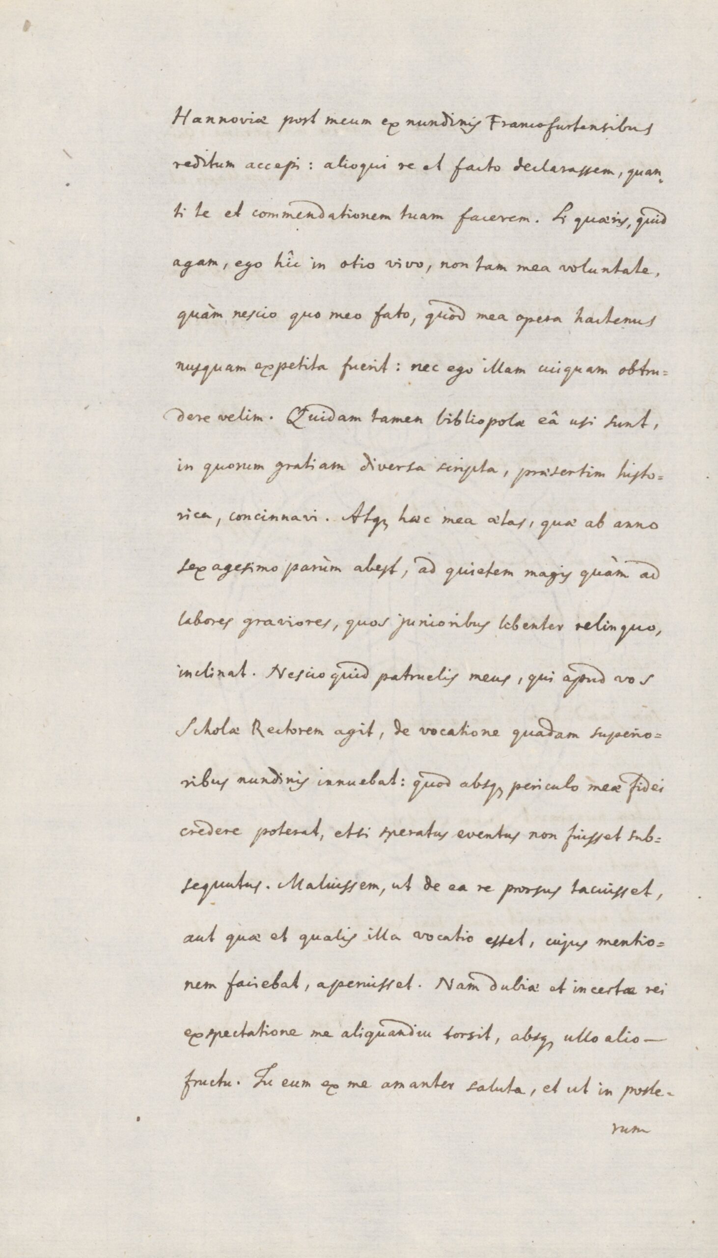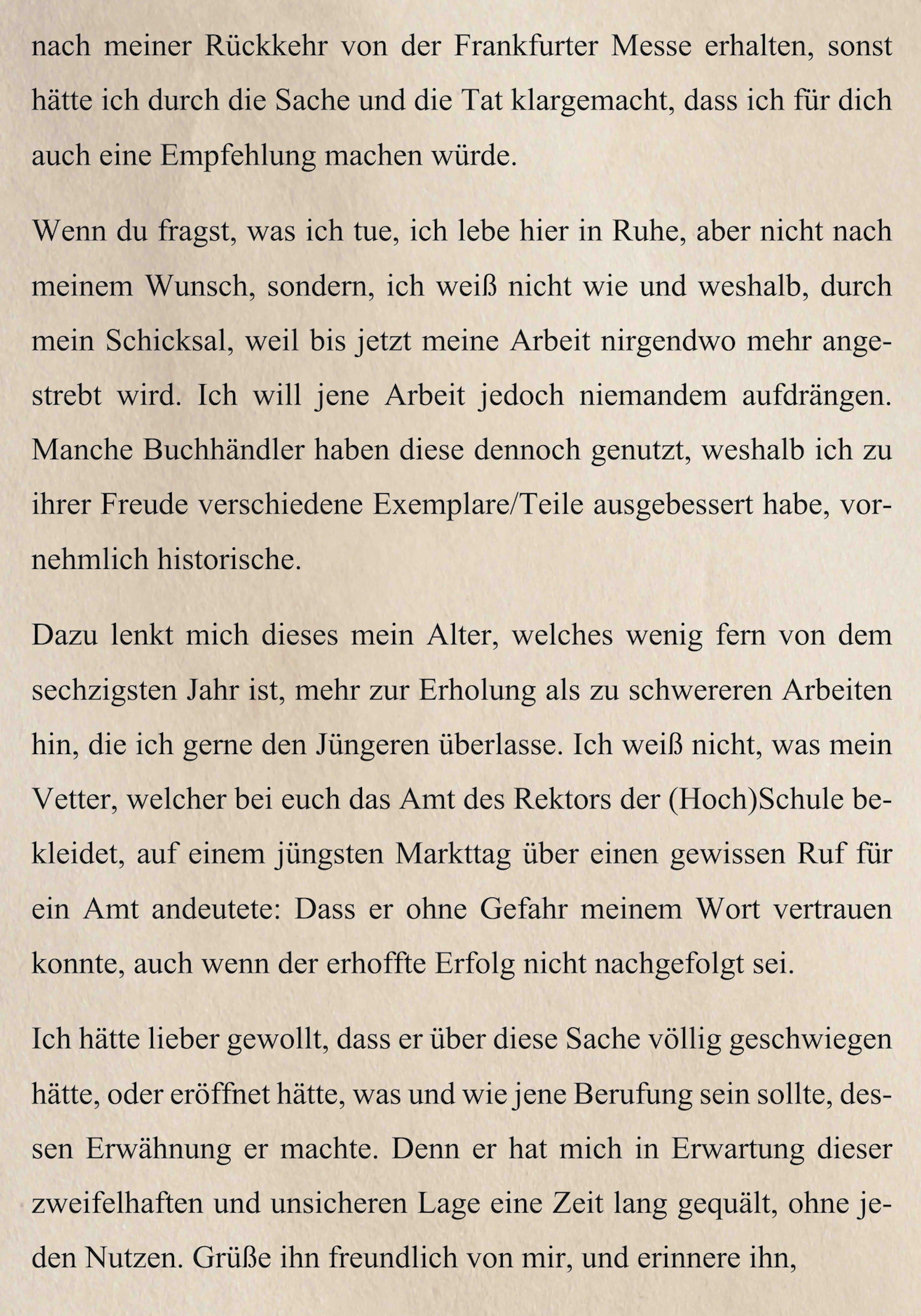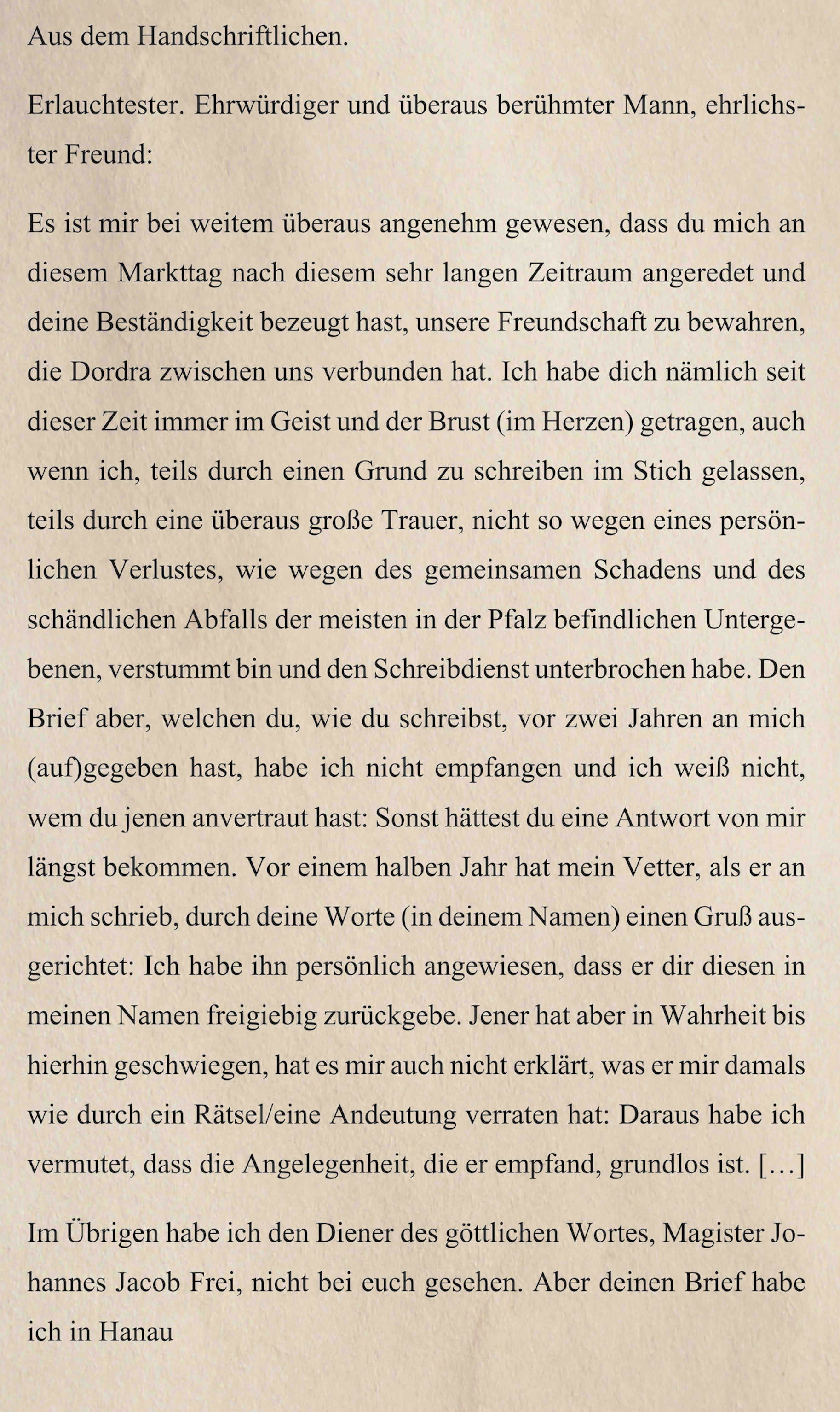 Dr. Tossanus beschwert sich anschließend darüber, dass sein Vetter erst eine vocatio (Z. 33), also einen Ruf oder eine Einladung für ein Amt angedeutet habe und dann aber nichts mehr dazu geschrieben hat. Dadurch hat sich Dr. Tossanus auf die Folter gespannt gefühlt. Daher bittet er Dr. Beck seinem Vetter liebe Grüße auszurichten und ihm zusagen, er solle in Zukunft präziser schreiben.