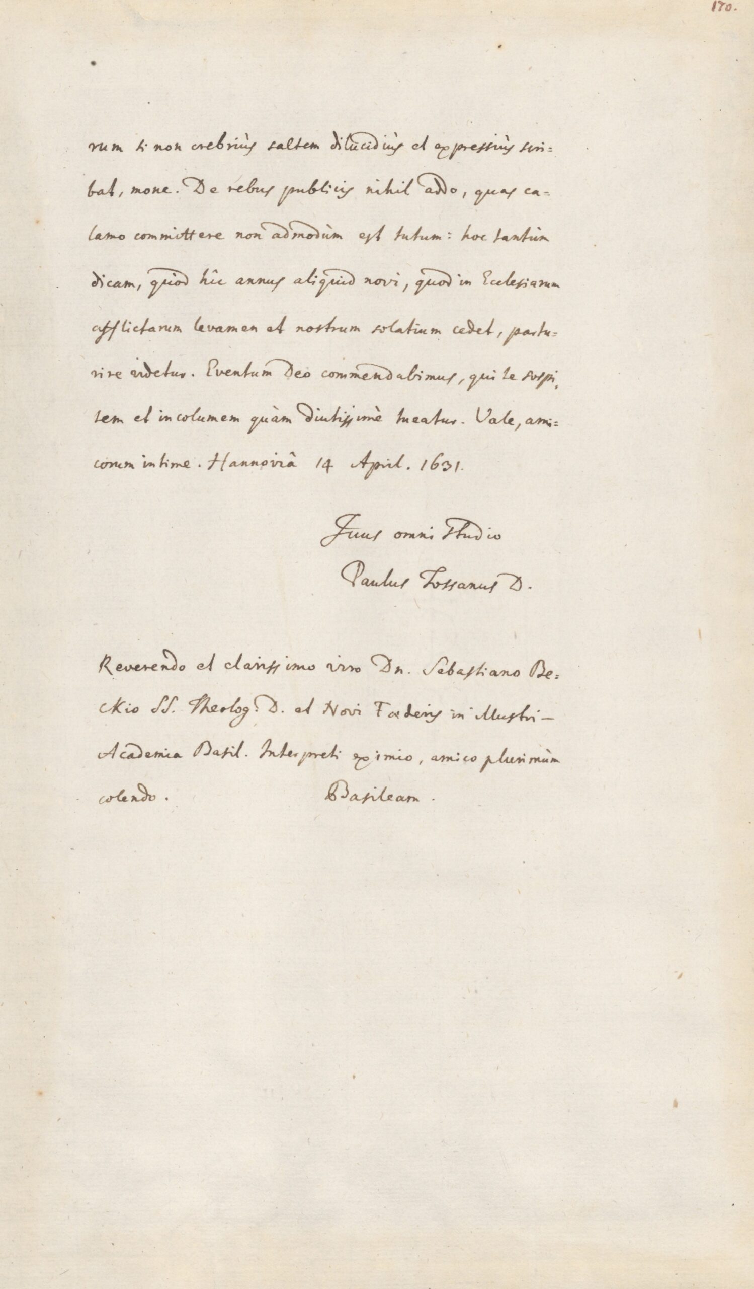 Am 14. April 1631 schreibt Dr. Paul Tossanus an seinen Freund Dr. Sebastian Beck einen Brief.